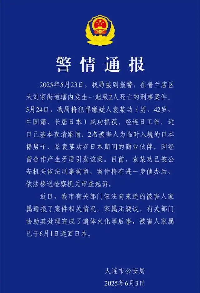 圖源:中國遼寧省大連市公安局 警方表示,經連日工作,近日已基本查清案情。2名被害人為臨時入境的日本籍男子,系袁某功在日本期間的商業夥伴,因經營合作產生矛盾引發該案。目前,袁某功已被公安機關依法刑事拘留,案件將在進一步偵辦後,依法移送檢察機關審查起訴。 近日,大連市有關部門依法向來大連的被害人家屬通報了案件相關情況,家屬無疑議。有關部門協助其處理完成了遺體火化等後事,被害人家屬已於6月1日返回日本。(完) 【編輯:淩玉輝】