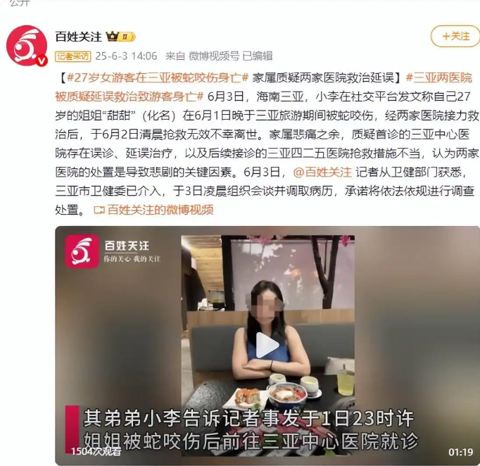 (報道截圖) 李先生稱,當時他姐姐和男朋友在一起,在一處花壇附近被咬傷,醫院初步診斷為蟲咬傷、不明物咬傷,後來他姐姐出現併發症昏厥抽搐,轉院去另一家醫院後身亡。 家屬悲痛之餘,質疑首診的三亞中心醫院存在誤診、延誤治療,以及後續接診的三亞四二五醫院搶救措施不當,認為兩家醫院的處置是導致悲劇的關鍵因素。 6月3日,當地衛健部門表示,三亞市衛健委已介入,於3日凌晨組織會談並調取病歷,承諾將依法依規進行調查處置。(完) 【編輯:李彥洲】