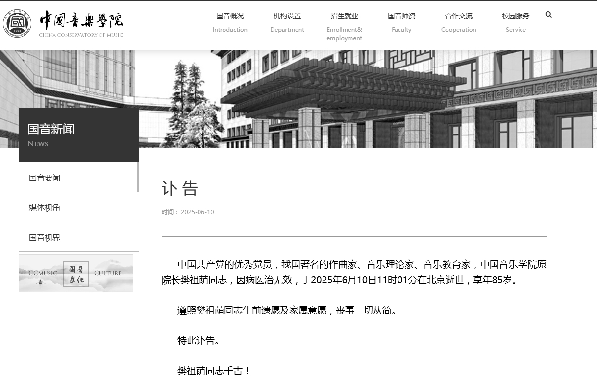香港中通社6月10日電 中國音樂學院官網10日發布訃告,中國著名作曲家、音樂理論家、音樂教育家,中國音樂學院原院長樊祖蔭因病醫治無效,於當日11時1分在北京逝世,享年85歲。