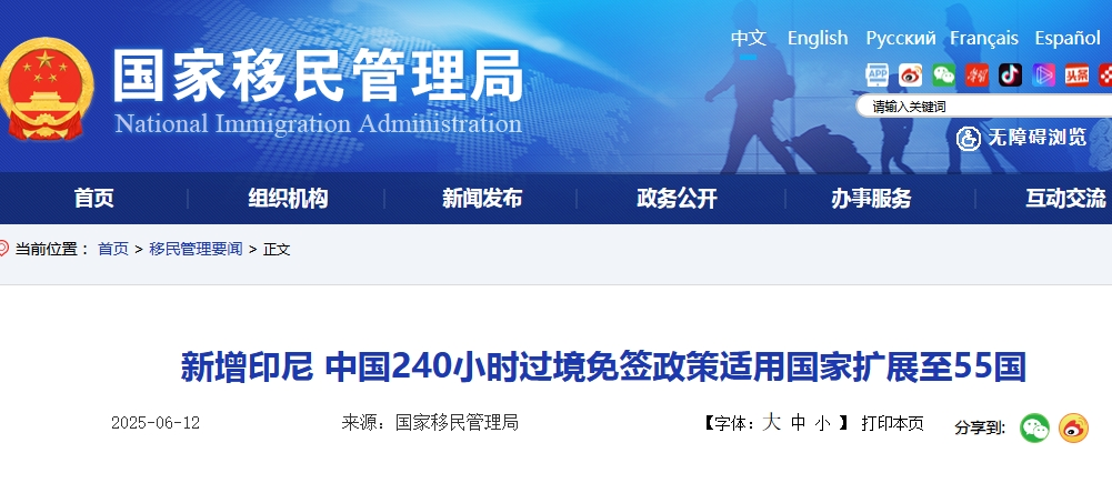 香港新聞網6月12日電 中國國家移民管理局今天發佈公告,自2025年6月12日起,印度尼西亞公民可適用240小時過境免簽政策便捷來華,中國240小時過境免簽政策適用國家增至55國。