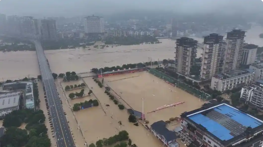 香港新聞網6月24日電 據當地航拍視頻顯示,24日中午,中國貴州榕江縣城區有大面積被淹,其中“村超”體育場已全部被淹沒。