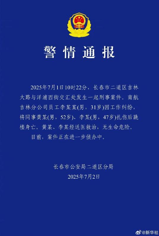 香港新聞網7月3日電 中國吉林省長春市公安局二道區分局7月2日晚發布警情通報:7月1日10時22分,長春市二道區吉林大路與洋浦西街交會處發生一起刑事案件。南航(中國南方航空)吉林分公司員工李某某(男,31歲)因工作糾紛,將同事黃某(男,52歲)、李某(男,47歲)扎傷後跳樓身亡。