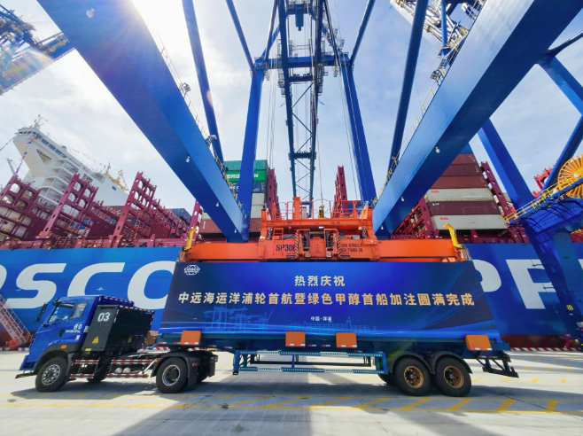 “中遠海運洋浦”輪完成首次綠色甲醇加注。(中遠海運供圖 央廣網發) “中遠海運洋浦”輪,是由中遠海運集團建造的中國國內首製甲醇雙燃料集裝箱船。船舶總長366米、型寬51米,最大裝箱量達16136TEU,並由中遠海運集運投運於洋浦港美洲航線。 該輪在船舶製造領域實現了“國內船東第一單、國內船廠交付第一艘、國產甲醇主機第一次實船應用”三個突破。充分驗證了“中國船+中國綠色燃料”的可行性,也展現了國內航運企業從船舶設計建造到綠色燃料供應的全鏈條自主能力,為全球航運業綠色低碳轉型提供“中國方案”。 此次“中遠海運洋浦”輪是國內首個城市垃圾製綠色甲醇“產、銷、用”全產業鏈貫通的應用案例,主要以城市餐廚垃圾、動物糞便等廢棄物發酵產生的沼氣為製作原料,實現了資源循環利用,溫室氣體排放量大幅降低,是真正意義上的全生命周期綠色燃料,並實現了從生物質原料採集、生產加工、儲運到終端加注的完整產業鏈閉環,全程落地海南島內,首次驗證了國內綠色甲醇“產供儲加”一體化模式的可行性。 根據國際海事組織統計,全球航運每年大約排放10億噸溫室氣體,佔運輸業排放量的13%。在全球“雙碳”目標下,綠色甲醇正在成為航運業脫碳轉型的關鍵替代燃料。(完) 【編輯:石歡歡】
