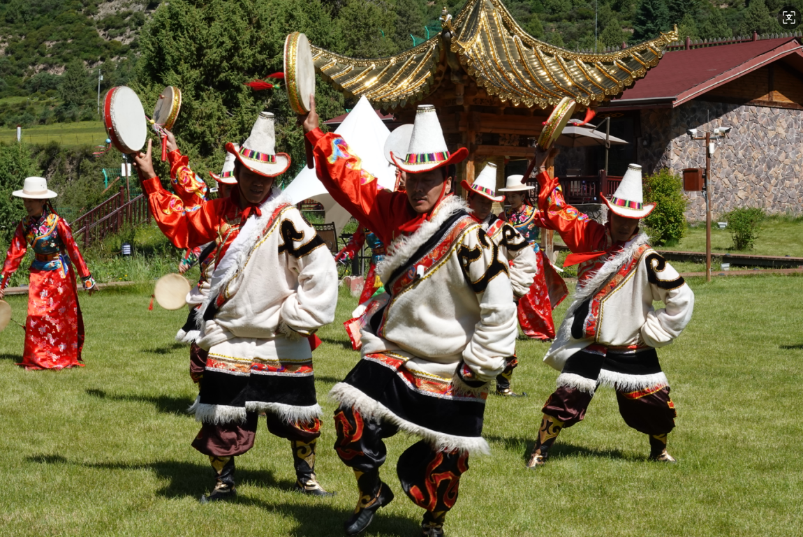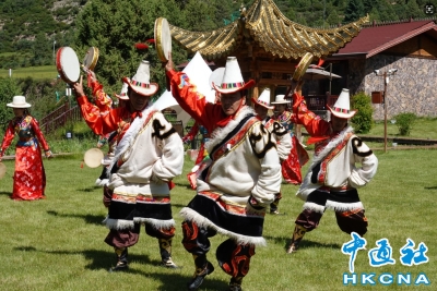 (香港中通社記者 譚暢攝) 海外華媒亦欣賞到“巴郎鼓”舞,該舞蹈藏語稱為“莎姆”舞,意為廣場上表演的一種祈禱平安的舞蹈,其淵源亦與古羌人的原始祭祀活動有關。藏族男兒們使用“羊皮鼓”這一特殊道具進行表演,手搖長柄雙面羊皮鼓,或小跳、或大跳,猿臂揮舞,動作大開大合,展現民族文化魅力。