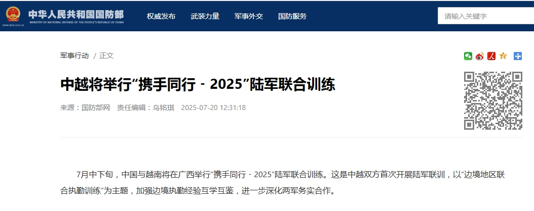 香港中通社7月20日電 據中國國防部20日消息,7月中下旬,中國與越南將在廣西舉行“攜手同行﹣2025”陸軍聯合訓練。這是中越雙方首次開展陸軍聯訓。