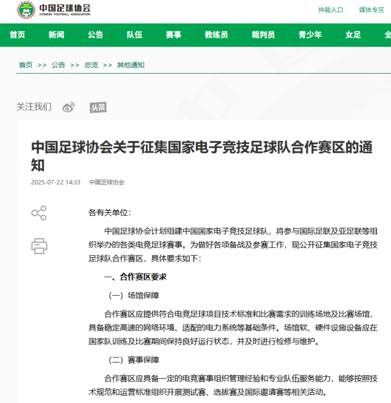 圖源:中國足球協會官網截圖 根據官方通知,這支國家隊將代表中國參加由國際足聯、亞足聯等權威組織舉辦的各類電競足球賽事。為了確保隊伍能高效備戰和參賽,足協正在徵集符合條件的合作賽區,並提出了一系列具體要求。 據悉,在場館設施方面,需要提供符合技術標準的訓練場地和比賽場館,確保網絡環境穩定高速,配備適應的電力系統等基礎設施,以保障訓練及比賽期間軟硬件設施的良好運行狀態。合作賽區還需具備豐富的電競賽事管理經驗,能夠有效組織測試賽、選拔賽等活動。 此外,在食宿與服務保障上,合作方需提供交通、住宿、醫療及媒體宣傳等全方位支持,同時配備專業團隊負責綜合服務保障工作。經費方面,合作賽區將承擔包括食宿交通、場租、安保、醫療等在內的多項費用,並參與國家隊備戰和參賽涉及的其他必要開支。 中國足球協會表示,對於有意向的合作單位,需在北京時間7月29日17時前提交相關材料。該會將基於收到的材料進行綜合評估,並最終確定合適的合作賽區。(完) 【編輯:彭玉婷】