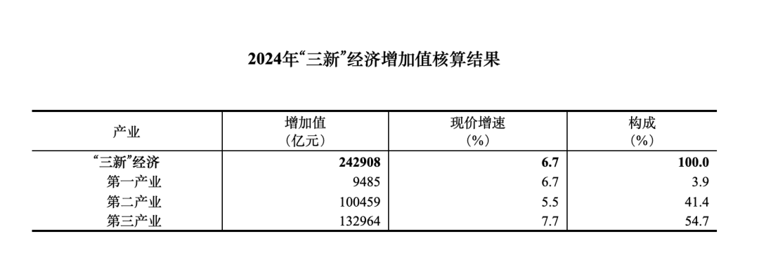 (圖源:中國國家統計局官網) 分三次產業看,“三新”經濟中,第一產業增加值為9485億元,比上年增長6.7%,佔比為3.9%;第二產業增加值為100459億元,比上年增長5.5%,佔比為41.4%;第三產業增加值為132964億元,比上年增長7.7%,佔比為54.7%。