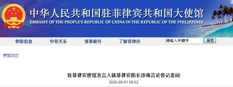 中國駐菲律賓大使館網站截圖 菲防長特奧多羅近日發聲表示,維護菲國家利益的一個重要方面就是抵制中國(在南海)的主張。中國的主張不僅包括主權權利,還包括“九段線”內所有水域無可爭辯的主權和領土完整。而菲根據《聯合國海洋法公約》,僅主張主權權利。 對此,中國駐菲使館發言人8月1日回應說,中國在南海問題上的立場和主張是明確的、一貫的,反映在一系列政府聲明、白皮書和文件當中。需要指出的是,中國在南海的領土主權和海洋權益是在長期歷史實踐中形成的,具有充分的歷史和法理依據,符合包括《聯合國海洋法公約》在內的國際法和國際實踐。只要認真閱讀中方立場文件,就不會得出類似於“中方主張斷續線內所有水域主權”的奇談怪論。 發言人表示,說到底,菲方一些人之所以不時拋出曲解攻擊中方主張的言論,恐怕更多出於激化兩國矛盾、誤導外界認知等方面的打算。此種做法再次印證了中國國防部發言人近日所說的,菲方是南海的麻煩製造者、危險製造者。(完) 【編輯:淩玉輝】
