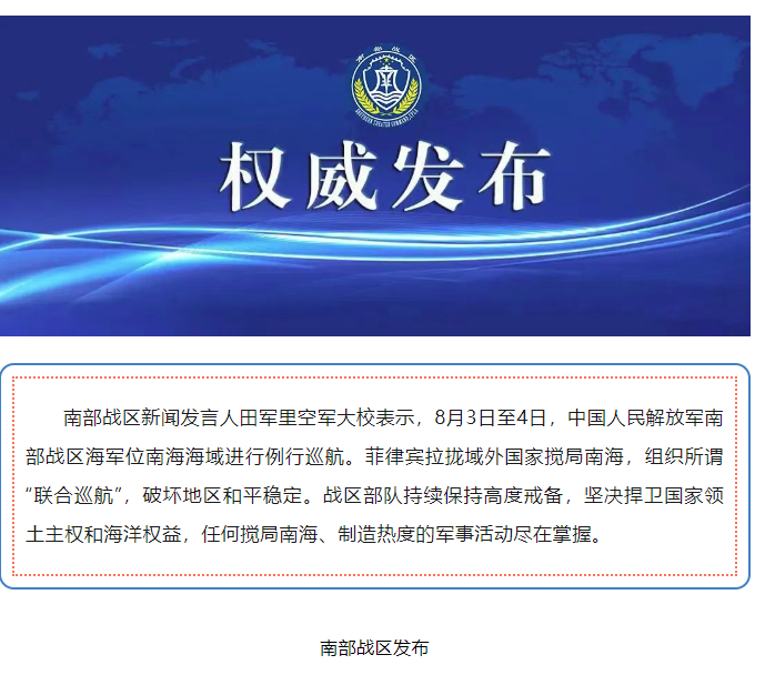 香港中通社8月4日電  據中國“南部戰區”微信公眾號消息,南部戰區新聞發言人田軍里空軍大校表示,8月3日至4日,中國人民解放軍南部戰區海軍位南海海域進行例行巡航。
