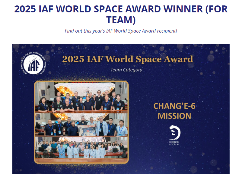 嫦娥六號任務團隊榮獲2025年度IAF世界航天獎。(圖源:IAF官網) 2024年5月3日,嫦娥六號探測器由長征五號遙八運載火箭在中國文昌航天發射場發射升空,6月2日精準著陸在月球背面南極-艾特肯盆地預選區域並開展採樣工作。6月25日,嫦娥六號返回器攜帶1935.3克月球背面樣品,順利返回地球,成功完成人類首次月球背面採樣壯舉。 據了解,嫦娥系列探測器及其發射使用的長征系列運載火箭,均由中國航天科技集團有限公司研製。嫦娥六號任務自發射後歷經53天、11個飛行階段,突破了月球逆行軌道設計與控制、月背智能快速採樣、月背起飛上升等關鍵技術,首次獲取月背的月球樣品,並搭載4台國際載荷,開展了務實高效的國際合作。 世界航天獎是IAF設立的航天領域最高獎項,旨在表彰在全球航天科學、技術、醫學、工程管理等領域作出重大貢獻的個人或團隊。今年的IAF世界航天獎將於9月29日至10月3日在澳大利亞悉尼舉行的第76屆國際宇航大會開幕式上頒發。此前,嫦娥四號團隊以及天問一號探測器研製團隊分別於2020年、2022年獲獎。(完) 【編輯:石歡歡】