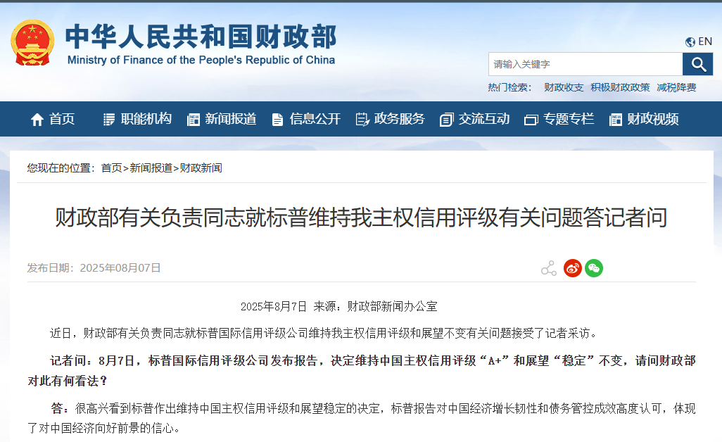 香港中通社8月7日電 8月7日,標普國際信用評級公司發布報告,決定維持中國主權信用評級“A+”和展望“穩定”不變。中方當天回應稱,標普報告對中國經濟增長韌性和債務管控成效高度認可,體現了對中國經濟向好前景的信心。