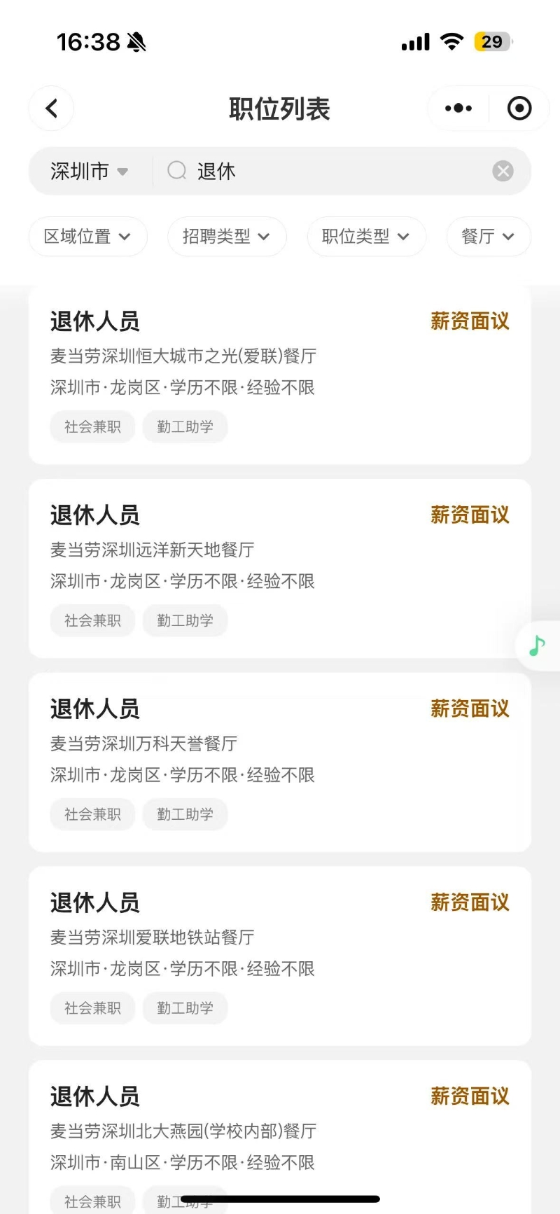 圖源:麥當勞的招聘小程序“麥當勞加入我們” 報道稱,早在2022年,麥當勞便在“老年人才網”上發布了招聘信息,招聘對象為女50歲以上、男60歲以上的退休人員,實行彈性工作制度,每月薪資在1800元至3500元人民幣之間。 目前,在麥當勞的招聘小程序中,“退休返聘”仍是一個重要的招聘類型,涉及崗位包括餐廳員工、值班主管和共享清潔員等。(完) 【編輯:彭玉婷】