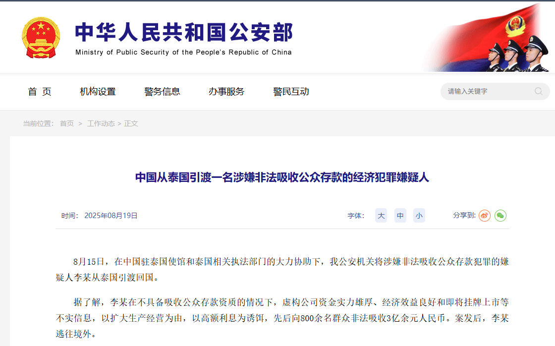 圖源:中國公安部官網截圖 據中國公安部微信公眾號8月19日消息,在中國駐泰國使館和泰國相關執法部門的協助下,中國公安機關15日將涉嫌非法吸收公眾存款犯罪的李某從泰國引渡回中國。 中國公安部稱,該嫌疑人在不具備吸收公眾存款資質的情況下,虛構公司資金實力雄厚、經濟效益良好和即將掛牌上市等不實信息,以擴大生產經營為由,以高額利息為誘餌,先後向800餘名群眾非法吸收3億餘元人民幣。案發後,李某逃往境外。 李某外逃後,中國公安機關開展追逃追贓工作。2023年9月,河南省商丘市睢陽區人民檢察院以涉嫌非法吸收公眾存款罪對李某批准逮捕。2024年10月,國際刑警組織對其發布紅色通報。2025年6月,泰國有關部門將李某逮捕,並依法判決將其引渡回中國。 中國公安部相關負責人表示,李某的成功引渡,是中泰兩國執法司法合作不斷深化、雙邊互信不斷加強的成果,彰顯了公安機關維護公民財產安全、捍衛法律底線的堅定決心,對今後中國與其他國家建立和深化執法合作起到積極示範作用。(完) 【編輯:彭玉婷】