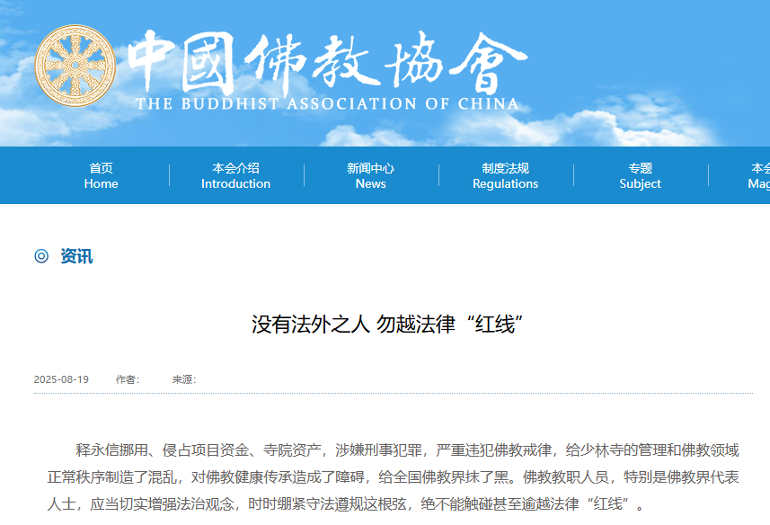 中國佛教協會官網截圖 綜合媒體20日報道,該篇文章題為《沒有法外之人 勿越法律“紅線”》。文章強調,佛教教職人員作為國家公民,必須遵守憲法和法律法規,守法是公民的基本義務,也是佛教信仰的內在要求。佛教戒律明確規定,受戒者不得做國賊、謗國主、漏國稅或犯國制,並倡導“上報四重恩”,包括報國家恩。 文章指出,佛教界代表人士應以身作則,成為守法、道德和自律的表率,始終牢記“國法大於教規”。 8月7日,中國佛教協會曾刊文《堅持以戒為師 推動我國佛教健康傳承》,批評釋永信毫無戒律敬畏,追名逐利、貪圖享樂,墮入違法犯罪深淵,不僅斷送個人前途,也令佛教界蒙羞。其行為敗壞教風,侵蝕佛教健康肌體,破壞出家人形象。 7月27日,少林寺官網通報,釋永信涉嫌挪用寺院資產、長期與多名女性保持不正當關係並育有私生子,目前正接受多部門聯合調查。中國佛教協會隨後表示支持依法處理,並註銷釋永信戒牒。目前,印樂法師接任少林寺住持。(完) 【編輯:彭玉婷】