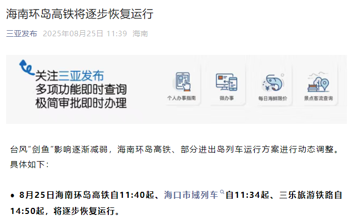香港中通社8月25日電 據“三亞發布”微信公眾號消息,颱風“劍魚”影響逐漸減弱,海南環島高鐵、部分進出島列車運行方案進行動態調整。