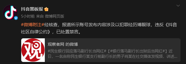 圖源:“抖音黑板報”微博賬號截圖 抖音黑板報發文稱:“經核查,報道所示賬號發布內容涉及以犯罪經歷博眼球,違反《抖音社區自律公約》,已處置禁言。”目前,該賬號已顯示為無法關注狀態,其視頻作品已全部下架。 此前,媒體引述裁判文書網顯示,肖某生於1983年,2006年大學畢業後加入民生銀行航天橋支行,2014年底任副行長,負責理財業務,直接領導為行長張穎。 2017年4月13日,張穎因偽造理財產品被公安機關帶走,揭開涉案27.46億元(人民幣,下同)的“假理財案”。張穎自2013年起以高息誘騙147名客戶簽訂虛假理財協議,將資金轉入其控制的賬戶。肖某明知產品不規範,仍協助推銷13.8億元,偽造簽名並加蓋假公章,致資金脫離監管。 2019年一審判決認定張穎犯合同詐騙罪,判無期徒刑,沒收全部財產;肖某被判合同詐騙罪,獲刑十年。二審改判肖某犯吸收客戶資金不入賬罪,判九年,罰款9萬元;張穎刑期不變。(完) 【編輯:彭玉婷】