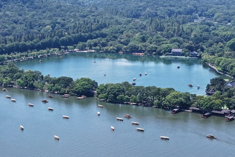 8月24日,遊客在浙江省杭州市西湖乘船遊玩(無人機照片)。圖片來源:新華社 中通社記者近日造訪西湖。沿湖畔徒步而行,無論走到西湖哪一面,抬眸映入眼簾皆是記者左中右三個朝向完整且連貫的天際線,不曾被高聳的建築阻隔。與此同時,從湖西亦可遠眺湖東商圈的繁華。 夜晚的西湖一帶,如雷峰塔、斷橋、保俶塔等名勝古跡上點綴了恰到好處的燈光。笑語盈盈的遊賞人潮絡繹如織,其間不時傳來指點這些建築的話音。除了湖畔路燈以及小食、文創店舖的星點燈火,整片西湖還是沉浸在屬於夜晚的幽暗之中。