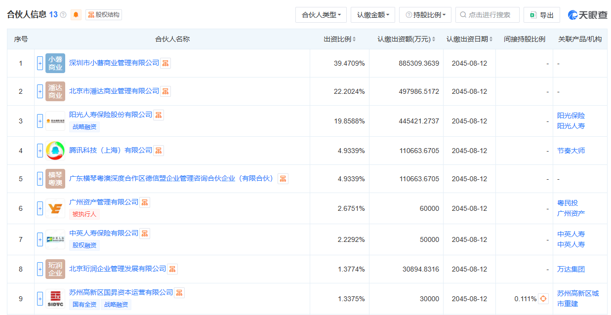 圖源:天眼查網頁截圖 綜合報道,交易涉及北京、廣州、成都等39個城市的重資產項目,預計今年下半年完成交割,萬達商管將繼續負責日常運營。交易獲監管當局無條件批准,凸顯萬達自救進展。 蘇州寬遇股東中,騰訊通過旗下公司持股約44.4%(出資約100億元),京東通過北京潘達持股22.2%(出資約50億元),陽光人壽持股19.9%,太盟集團持股約5%,其餘包括廣州及蘇州國資企業等。騰訊與京東均為萬達老合作夥伴,2018年曾聯合蘇寧、融創以340億元入股萬達商管。此次交易通過專項基金平台完成,延續了雙方合作模式。 此外,騰訊與萬達成立的“深圳智薯投資合夥企業”(註冊資本160.8億元)及京東與萬達成立的“北京泓睿潘達管理諮詢合夥企業”(註冊資本80.5億元)可能與此次交易相關,但萬達方面未予置評。據報,交易或為2018年Pre-IPO投資的退出機制重構。 萬達近年來持續“瘦身”以緩解債務壓力。2023年,太盟等投資人600億元入股珠海萬達商管,化解380億元債務,但股權重組因仲裁受阻。去年,萬達出售近26座萬達廣場。截至去年底,萬達擁有513座萬達廣場。 市場分析認為,此交易反映萬達加速輕資產轉型,聚焦商業管理服務。接盤方騰訊、京東等互聯網巨頭或通過數字化改造提升萬達廣場價值,但部分三四線城市項目租金回報率承壓,協同管理效率將是挑戰。(完) 【編輯:彭玉婷】