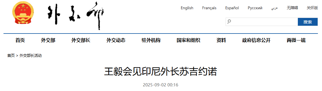 圖源:中國外交部官網截圖 蘇吉約諾轉交普拉博沃總統致習近平主席的信函,表示普拉博沃總統因近日國內局勢無法如期來華,特委派我代表他來華參加有關活動。印尼高度重視發展對華友好關係,預祝活動取得圓滿成功。印尼政府承諾全力保障在印尼的中國人員和機構安全。