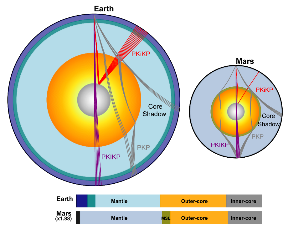 地球和火星深部結構對比示意圖 圖源:中國科學技術大學 結合不同火核震相,團隊測得火星固態內核半徑約600公里,佔火星半徑的1/5。若將火星按比例放大至地球大小,其內外核結構比例與地球高度接近。 該研究首次在地球以外的行星中確認了固態內核的存在,突破性地證實了火星與地球相似的核幔分異結構。(完)