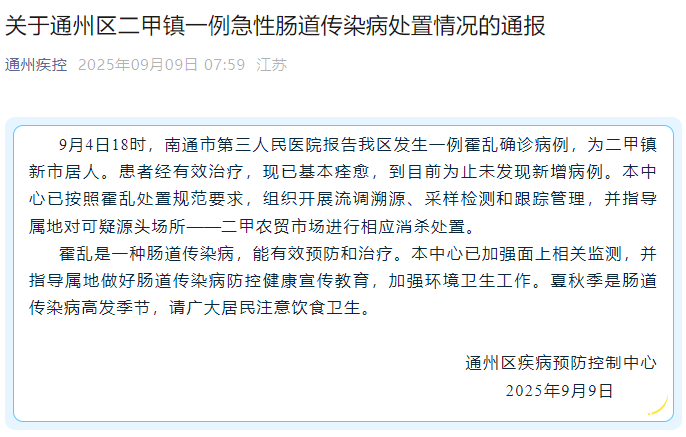 香港中通社9月9日電 中國江蘇省南通市通州區疾病預防控制中心微信公眾號“通州疾控”9月9日發布通報稱:9月4日,南通市第三人民醫院報告通州區發生一例霍亂確診病例,為二甲鎮新市居人。