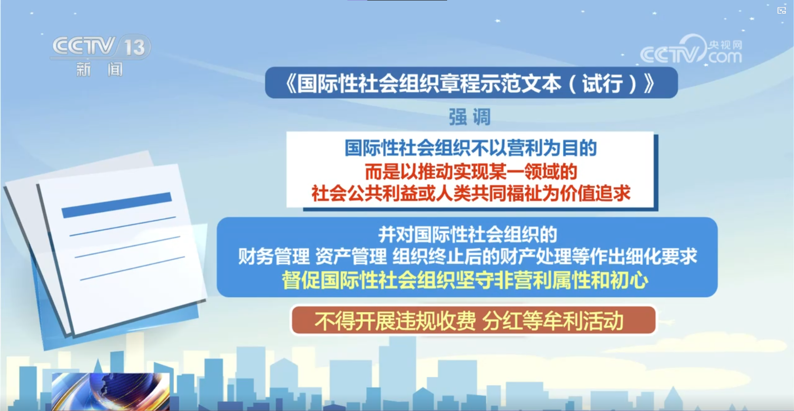 圖源:央視新聞視頻截圖 《國際性社會組織章程示範文本(試行)》適用於由境內外發起人共同發起,在中國境內成立登記,以促進國際合作、加強國際交流、參與國際事務為宗旨的國際性、非營利性的社會團體。 《國際性社會組織章程示範文本(試行)》明確,國際性社會組織在運行中,應當堅持國際性,不得在宗旨、業務範圍、會員組成等方面偏離促進國際合作、國際交流等定位。在會員組成方面,可面向所涉領域廣泛吸納會員,要求符合條件的外籍會員原則上佔比不低於會員總數的1/3,並選擇至少一門外語作為工作語言。 中國央視引述民政部社會組織管理局涉外社會組織工作處處長王博表示,國際性社會組織顧名思義,主要是面向國際發展會員、開展活動。《國際性社會組織章程示範文本(試行)》充分借鑒知名國際組織治理經驗和治理規則,堅持共商、共建、共享的理念,給予國際性社會組織更大自主權,支持其攜手世界各國會員參與國際合作,推動各國人民互聯互通、互學互鑒、互利共贏。 民政部介紹,截至目前,民政部共登記國際性社會組織62家,其中有國際科技組織33家,佔國際性社會組織總量的53%。近年來,這些國際性社會組織活躍在民生、經濟、文化、科技、體育、能源、醫學、旅遊等領域,為共建“一帶一路”、參與全球治理作出了積極貢獻。(完) 【編輯:彭玉婷】