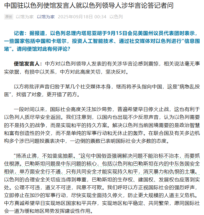 記者:據報道,以色列總理內塔尼亞胡於9月15日會見美國州議員代表團時表示,一些國家包括中國和卡塔爾,投資人工智能技術、通過社交媒體對以色列進行“信息圍堵”。請問使館對此有何評論? 使館發言人:中方對以色列領導人發表的有關涉華言論感到震驚,相關說法毫無事實依據,有損中以關係,中方對此高度關切,堅決反對。 以方將批評聲音歸咎於某幾個社交媒體本身,繼而將矛頭指向中國,這是“病急亂投醫”,找錯了對象,更開錯了藥方。 一段時間以來,國際社會高度關注加沙局勢,普遍希望早日停火止戰,這也有利於以色列人質盡早安全返回。我們注意到,以國內也出現不少反思聲音,認為以色列需要的不是持久的戰爭,而是實現和平的持久方案。解決以色列當前困境需要的是政治智慧和富有創造性的外交,而不是單純的軍事行動和無休止的轟炸。在聯合國及有關多邊機構多個涉巴問題投票表決中,一邊倒的票數已表明國際社會大多數的態度。 “揚湯止沸,不如釜底抽薪。”這句中國俗語強調解決問題不能治標不治本,而要抓住根源。巴勒斯坦問題是中東問題的核心,包括以色列和巴勒斯坦在內的中東各國安全相依,單方面安全行不通,只有共同安全才能實現持久和平,消滅暴力和仇恨的土壤。以色列的合理安全關切應當得到尊重,巴勒斯坦的生存權、建國權、發展權也應落到實處。公理不可違,道義不可逆,民意不可欺。我們呼籲以方正視國際社會的強烈呼聲,立即停止在加沙的軍事行動,盡快實現全面持久停火,防止更大規模的人道主義危機。中方真誠希望早日實現地區國家和平共存,實現地區和平穩定、共同繁榮,願同國際社會一道為緩和地區局勢發揮建設性作用。(完) 【編輯:馬華】