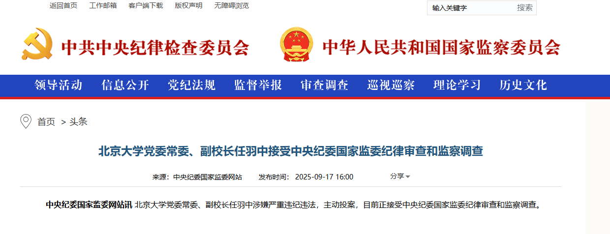 香港中通社9月17日電 9月17日,中央紀委國家監委網站發布消息:北京大學黨委常委、副校長任羽中涉嫌嚴重違紀違法,主動投案,目前正接受中央紀委國家監委紀律審查和監察調查。