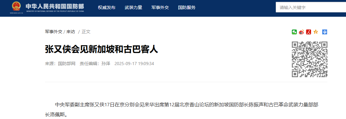 張又俠分別會見新加坡與古巴防務高層分享到: