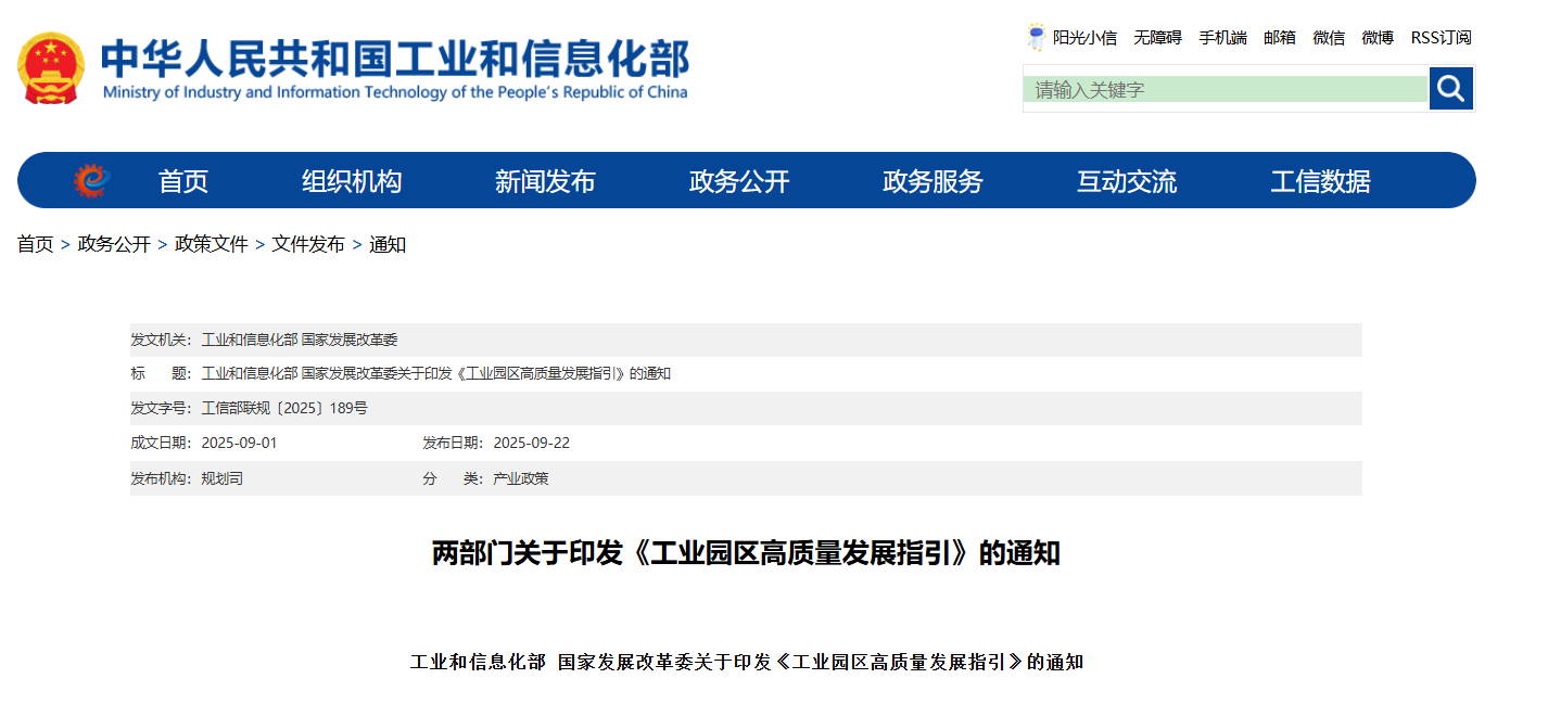 圖源:中國工業和信息化部網站截圖 綜合24日消息,當前,工業園區作為工業發展的重要載體,面臨內部改革深化與外部環境變化的雙重挑戰。《指引》提出,工業園區需明確產業定位,原則上主導產業不超過3個,避免低水平、同質化競爭,強化特色優勢,打造效益顯著的產業集群。同時,建立產業評估監測機制,優化發展布局。 在產業鏈建設方面,《指引》鼓勵推行“鏈長制”,推動產業鏈上下游集聚發展,通過鏈式招商、產學研合作等方式補鏈強鏈。推動傳統產業技術改造與設備更新,淘汰落後產能,並因地制宜布局新興產業與未來產業,培育新賽道新動能。 《指引》強調提升科技創新與數字融合能力,支持園區建設人工智能、雲計算等新型基礎設施。完善空間治理,探索彈性年期出讓、先租後讓等土地供給方式,提高土地利用效率。