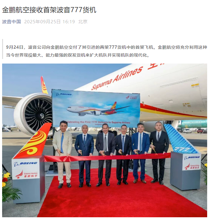 波音公司於24日向金鵬航空交付了兩架777貨機中的首架。圖源:“波音中國”微信公眾號截圖 金鵬航空表示,777貨機將補充其現有747貨機機隊,實現高達3米行業標準貨物的無縫聯運,並具備107噸的高密度貨物運載能力。 波音民機集團全球銷售副總裁高思翔指出,777貨機將為金鵬航空帶來更大運力和更高效率,助力其不斷擴展的貨運業務。自2009年中國民航引進首架777貨機以來,該機型已成為中國遠程貨運機隊的主力,目前六家中國航司運營近60架777貨機。 中國商務部發言人何亞東24日在例行記者會上表示,當前影響中美正常經貿合作的最大障礙是美方的單邊限制措施。此番波音恢復交付及潛在大額訂單談判,標誌著中美在經貿領域的緊張關係有所緩和。 另據彭博社報道,美國駐華大使龐德偉表示,美中正就波音公司“巨額”訂單進行最後階段談判,協議有望很快敲定。盡管具體訂單規模尚未披露,但報道稱,波音正推動一項涉及多達500架飛機的協議,旨在打破自2017年以來因中美經貿摩擦導致的銷售低迷。(完) 【編輯:彭玉婷】