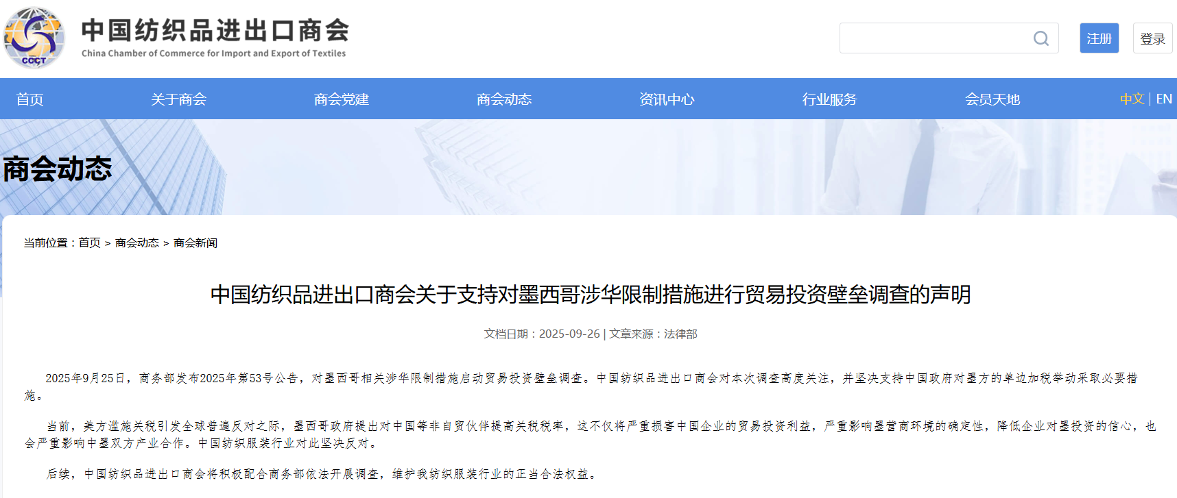 (中國紡織品進出口商會官網截圖) 據中國紡織品進出口商會聲明指,商會對本次調查高度關注,並堅決支持中國政府對墨方的單邊加稅舉動採取必要措施。 中國紡織品進出口商會表示,當前,美方濫施關稅引發全球普遍反對之際,墨西哥政府提出對中國等非自貿夥伴提高關稅稅率,這不僅將嚴重損害中國企業的貿易投資利益,嚴重影響墨營商環境的確定性,降低企業對墨投資的信心,也會嚴重影響中墨雙方產業合作。中國紡織服裝行業對此堅決反對。 後續,中國紡織品進出口商會將積極配合商務部依法開展調查,維護中國紡織服裝行業的正當合法權益。 中國五礦化工進出口商會聲明指,堅決支持商務部對墨西哥的貿易投資壁壘調查。作為鋼鐵、鋁、塑料、玻璃等行業的代表組織,商會呼籲受墨西哥措施影響的國內產業和會員企業積極參與調查,並支持中方採取一切必要措施來捍衛中國企業的正當權益。 9月25日,中國商務部發布第53號公告,宣佈對墨西哥政府擬對中國等非自貿夥伴提高進口關稅的相關措施,啟動貿易投資壁壘調查。調查期限為6個月,特殊情況下可延長不超過3個月。 中國商務部發言人此前指出,在美國濫施關稅、全球貿易面臨挑戰之際,各國應共同抵制單邊主義,不應因外部壓力而犧牲第三方利益。即使相關措施符合世貿組織規則,若實質損害中國權益,中方仍堅決反對。(完) 【編輯:淩玉輝】