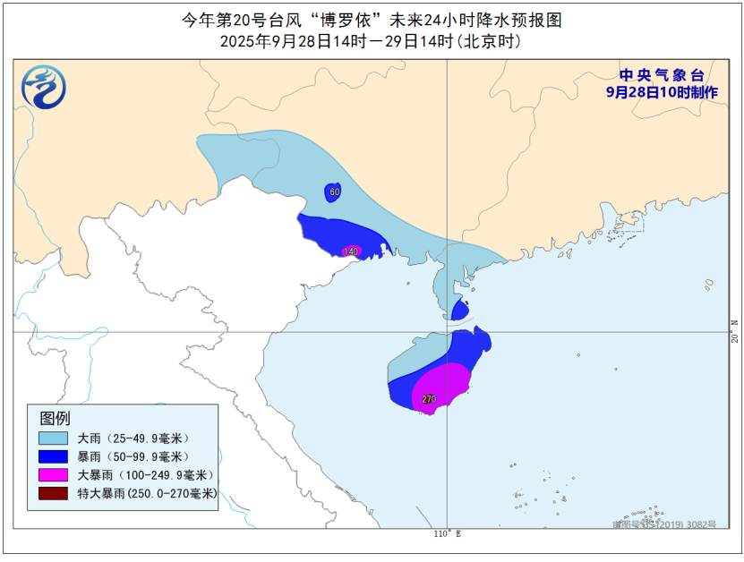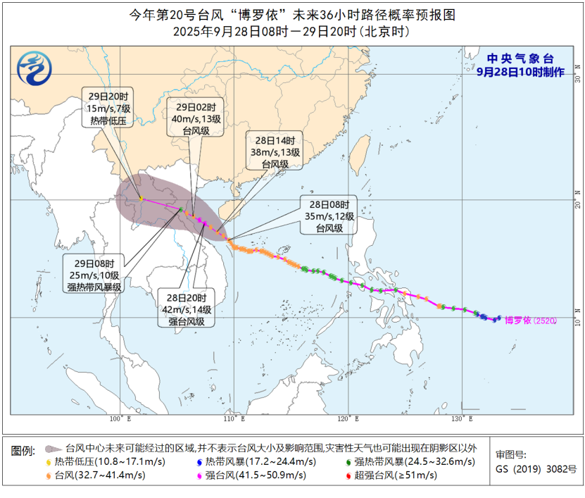 圖源:中央氣象台 據三亞市防災減災救災和安全生產委員會辦公室消息,三亞鳳凰國際機場28日9時至21時停止航班起降。截至28日1時,三亞全市共計轉移36842人。海南三亞、萬寧、陵水等多地發布停課通知,28日全天中小學校、幼兒園等停課。 中國中央氣象台預計,颱風“博羅依”將以每小時20至25公里的速度向西北方向移動,強度略有加強,並於28日下午掠過海南島以南海面,逐漸向越南中北部沿海靠近,28日夜間至29日早晨以颱風級或強颱風級(35-42米/秒,12-14級)在越南中北部沿海登陸。