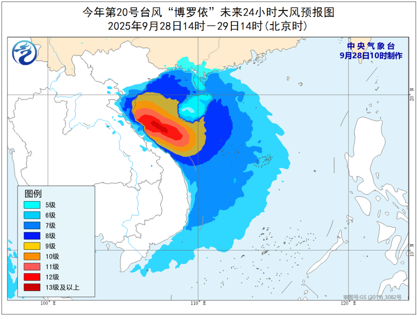圖源:中央氣象台 受其影響,28日14時至29日14時,中國南海西部、中沙群島和西沙群島附近海域、北部灣、瓊州海峽、廣東西部沿海、海南島及沿海、廣西沿海將有6-8級、陣風9-10級的大風,其中,南海中西部和西北部的部分海域、海南島南部沿海、北部灣偏南海域的風力有9-11級、陣風12-13級,颱風中心經過的附近海域或地區風力可達12-14級、陣風15-16級。