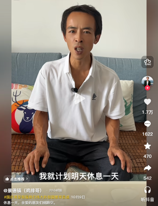 資料圖為“雞排哥” 央視新聞視頻截圖 “雞排哥”一句“做完你的做你的,場面我還能控制”等經典語錄引發網民熱議,相關視頻被大量“二創”,吸引全國各地遊客慕名前來打卡,掀起“雞排大道”排隊熱潮,單日排隊時長高達三小時,他也因此被景德鎮市文化廣電旅遊局授予“景德鎮文旅推介官”稱號。 面對火爆人氣,“雞排哥”堅持全勤出攤至10月8日(國慶假期最後一天)。他坦言,連日來工作強度極大,身心疲憊,甚至被網友調侃“累到失去表情管理”。他8日在社交平台發布視頻,向遠道而來的遊客致謝並致歉:“天氣炎熱,讓大家排幾個小時隊,很不好意思。”他表示,為保證後續服務質量,將於10月9日休息一天,以更飽滿的精神狀態回歸。