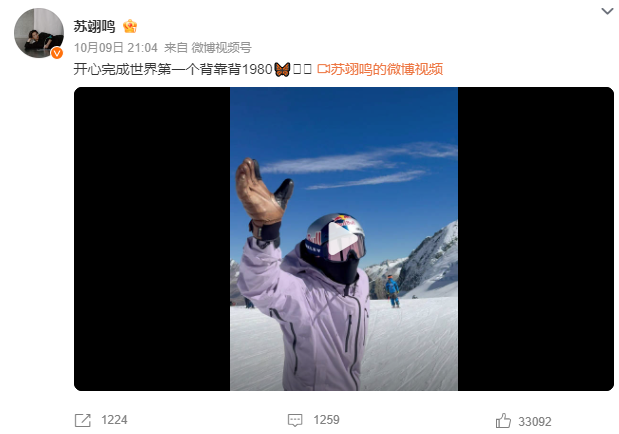 蘇翊鳴在微博曬出滑雪視頻 當晚,“蘇翊鳴世界第一個背靠背1980”詞條衝上熱搜。