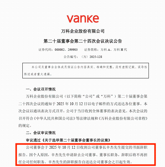 萬科公告截圖 萬科官網顯示,辛傑1966年出生,於1988年獲瀋陽工業大學工學學士學位;2005年獲香港理工大學工商管理碩士學位;現為正高級工程師、高級經濟師。曾先後供職於深圳聖廷苑酒店有限公司、深圳市長城投資控股股份有限公司、深圳市天健(集團)股份有限公司。現任深圳市地鐵集團有限公司黨委書記、董事長,萬科集團董事長。原定於2026年退休。