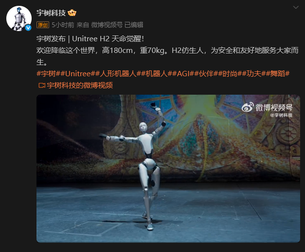 圖源:“宇樹科技”微博賬號截圖 宇樹科技發布的宣傳視頻顯示,Unitree H2機器人不僅能流暢完成走路、跳舞等基礎動作,還能精準駕馭打拳、側踢這類對身體協調性和平衡控制要求更高的動作。 值得關注的是,相較於前代產品Unitree H1,H2在外觀設計上首次融入了仿生人臉元素。 此前,宇樹科技創始人、CEO王興興表示,科技機器人算法今年已經歷幾次迭代,預計下半年將發布身高1.8米的人形機器人。 今年7月18日,中國證監會官網信息顯示,宇樹科技已在浙江證監局辦理上市輔導備案,輔導機構為中信證券。9月2日,宇樹科技公開表示,預計將在10月至12月期間向證券交易所提交上市申請文件。(完) 【編輯:彭玉婷】