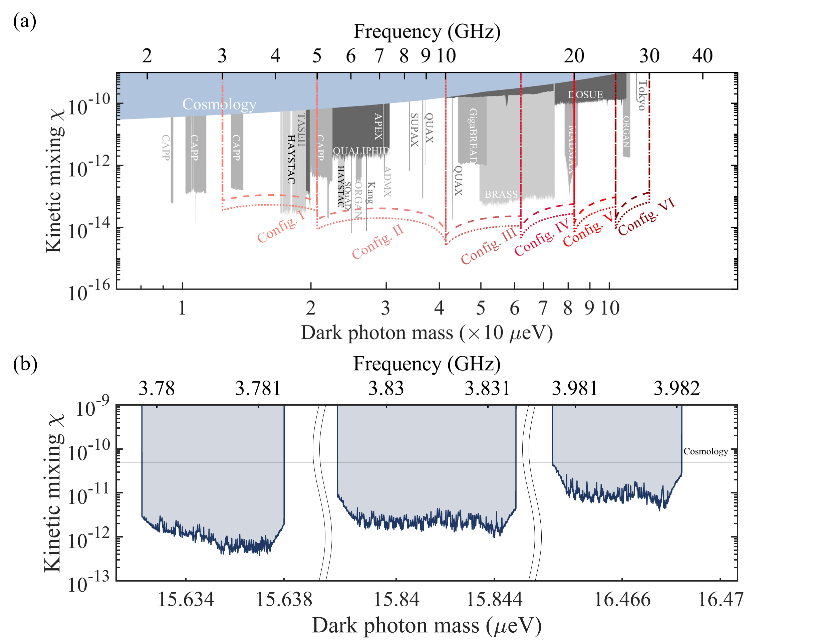 該研究成果10月29日發表於國際學術期刊《物理評論快報》(Physical Review Letters) 現代天文學與宇宙學觀測表明,暗物質約佔宇宙總質量25%。近年來,以軸子和暗光子為代表的超輕玻色子暗物質成為備受關注的暗物質候選者。理論預言,超輕暗物質的可能質量範圍約為1至100μeV,且與普通物質之間僅存在極微弱的相互作用。國際上已開展一系列超輕暗物質搜尋的實驗研究,但面臨測量範圍與探測靈敏度難以兼顧的技術挑戰。 該研究提出利用超導量子比特直接搜尋超輕暗物質的實驗架構。研究利用微納加工技術,在單個芯片上集成多個頻率可調的超導量子比特,形成可擴展的暗物質搜尋架構。這一架構可對暗物質多能區同步開展高靈敏掃描探測,有望解決測量範圍與靈敏度難以兼顧的問題。同時,研究設計製作了三比特超導量子芯片,可同時對三個能區的暗光子進行搜尋,並給出相應區間內最嚴格的暗光子-光子耦合界限。研究發現,實驗結果相較此前基於天文觀測的界限提升了1至2個數量級。