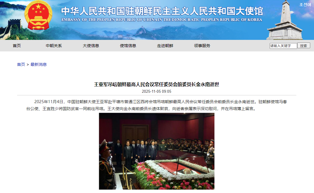 香港中通社11月5日電 據中國駐朝鮮大使館11月5日消息,11月4日,中國駐朝鮮大使王亞軍赴平壤市普通江區西將會館吊唁朝鮮最高人民會議常任委員會前委員長金永南逝世。
