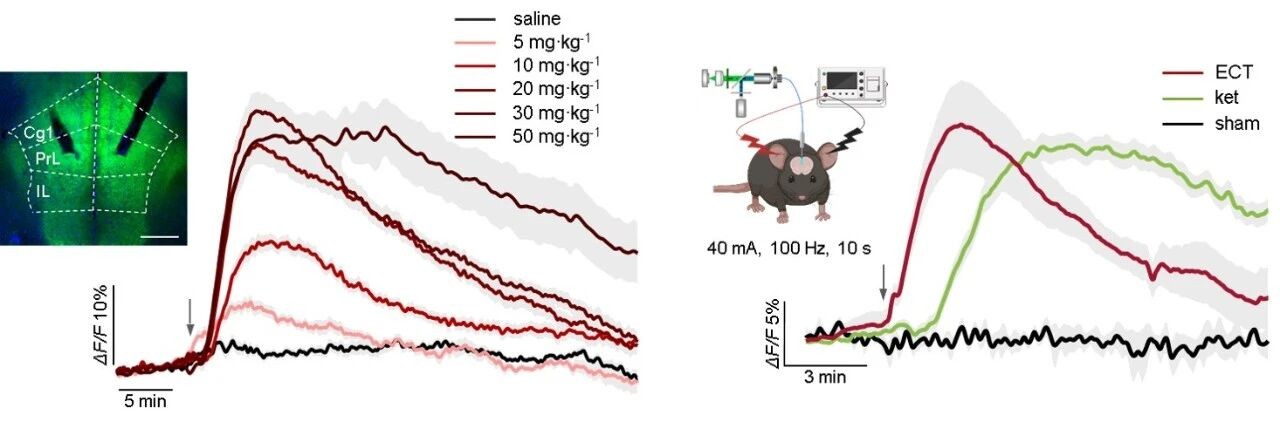 圖源:國際頂級期刊《自然》網站截圖 目前,全球約有三分之一的抑鬱症患者屬於“難治性抑鬱症”,對傳統藥物反應不佳。氯胺酮和ECT是主要干預手段,雖可在數小時內起效,卻伴隨致幻、成癮及認知損傷等嚴重副作用。由於機制不明,臨床應用長期處於“知其然不知其所以然”的困境。 羅敏敏團隊聯合中國多個頂尖實驗室,借助北京大學李毓龍團隊開發的基因編碼熒光探針技術,首次在活體動物大腦中觀測到:兩種療法均能迅速、持續提升情緒調控關鍵腦區的腺苷水平。