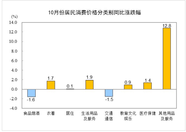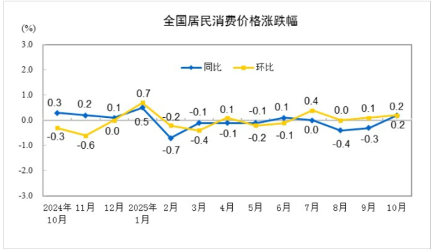 國家統計局發佈CPI和PPI數據“有漲有跌” 專家解讀來了!香港新聞網11月9日電 國家統計局今天發佈10月份CPI和PPI數據,10月份CPI同比上漲0.2%,PPI環比轉漲。國家統計局城市司首席統計師董莉娟解讀表示,10月份,擴內需等政策措施持續顯效,叠加國慶、中秋長假帶動,居民消費價格指數(CPI)環比上漲0.2%,同比上漲0.2%,扣除食品和能源價格的核心CPI同比上漲1.2%,漲幅連續第6個月擴大。受國內部分行業供需關係改善、國際大宗商品價格傳導等因素影響,工業生產者出廠價格指數(PPI)環比由上月持平轉為上漲0.1%,為年內首次上漲;同比下降2.1%,降幅比上月收窄0.2個百分點,連續第3個月收窄。 CPI環比漲幅擴大,同比由降轉漲 CPI環比上漲0.2%,漲幅比上月擴大0.1個百分點且略高於季節性水平。服務價格由降轉漲。服務價格由上月下降0.3%轉為上漲0.2%,高於季節性水平0.2個百分點,影響CPI環比上漲約0.07個百分點。服務中,國慶、中秋雙節叠加,出行需求較旺,賓館住宿、飛機票和旅遊價格分別上漲8.6%、4.5%和2.5%,漲幅均高於季節性水平;醫療服務價格上漲0.5%。食品價格漲幅高於季節性。食品價格上漲0.3%,季節性水平為下降0.1個百分點。其中節日期間消費需求增加,鮮菜、羊肉、鮮果、蝦蟹類和牛肉價格漲幅在0.5%—4.3%之間。工業消費品價格穩中有漲。能源價格下降0.4%,扣除能源的工業消費品價格上漲0.3%,影響CPI環比上漲約0.07個百分點,其中受國際金價上漲影響,國內金飾品價格上漲10.2%。