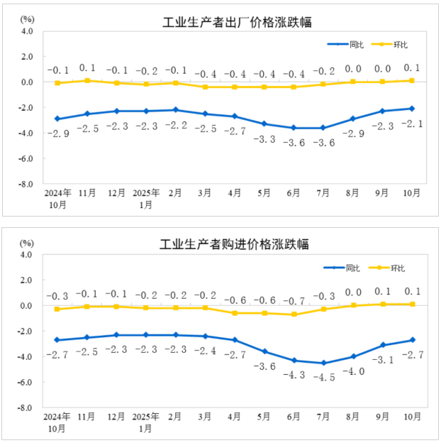圖源:國家統計局。 CPI同比由上月下降0.3%轉為上漲0.2%。其中,食品和能源價格仍處低位,但降幅均有收窄。食品價格下降2.9%,降幅比上月收窄1.5個百分點,影響CPI同比下降約0.54個百分點。食品中,豬肉、雞蛋和鮮菜價格降幅在7.3%—16.0%之間,降幅均有收窄;牛肉、羊肉和水產品價格漲幅在2.0%—5.6%之間,漲幅均有擴大。能源價格下降2.4%,其中汽油價格下降5.5%,影響CPI同比下降約0.18個百分點。扣除食品和能源價格的核心CPI同比上漲1.2%,漲幅連續第6個月擴大,為2024年3月以來最高。服務價格自3月份起逐步回升,本月上漲0.8%,漲幅比上月擴大0.2個百分點。其中飛機票和賓館住宿價格分別上漲8.9%和2.8%;醫療服務和家政服務價格分別上漲2.4%和2.3%。扣除能源的工業消費品價格上漲2.0%,漲幅連續第6個月擴大,其中金飾品和鉑金飾品價格分別上漲50.3%和46.1%;擴內需等政策效應繼續顯現,家用器具、文娛耐用消費品和家庭日用雜品價格漲幅在2.4%—5.0%之間,燃油小汽車價格降幅收窄至2.3%。 PPI環比由平轉漲,同比降幅繼續收窄 PPI環比由上月持平轉為上漲0.1%,為年內首次上漲。本月PPI環比運行的主要特點:一是供需關係改善帶動部分行業價格上漲。煤炭開采和洗選業價格環比上漲1.6%,煤炭加工價格上漲0.8%,光伏設備及元器件製造價格上漲0.6%,均連續2個多月上漲。水泥製造、計算機整機製造、鋰離子電池製造、集成電路製造價格均由降轉漲,分別上漲1.6%、0.5%、0.2%和0.2%。二是輸入性因素影響國內有色金屬和石油相關行業價格走勢分化。國際有色金屬價格上行帶動國內有色金屬礦采選業價格環比上漲5.3%,有色金屬冶煉和壓延加工業價格上漲2.4%,其中金冶煉、銅冶煉價格分別上漲8.7%和4.3%;國際油價下行影響國內石油和天然氣開采業價格下降2.3%,精煉石油產品製造價格下降0.8%。