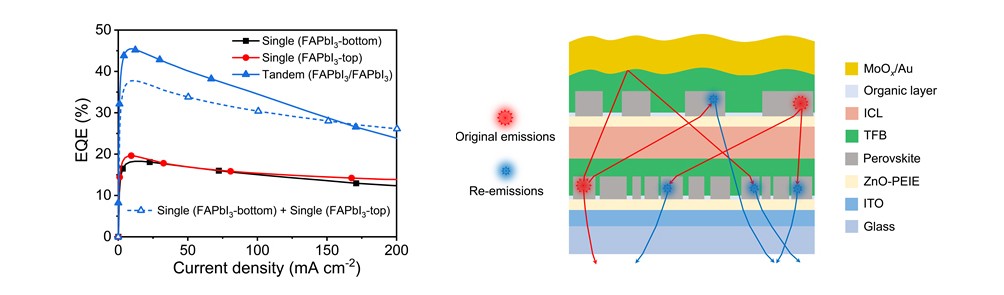 圖源:南京工業大學 針對這一世界性難題,團隊通過優化連接層結構,實現了疊層器件中高效的電荷注入與平衡。更為重要的是,通過調控鈣鈦礦發光層的微納結構,創新性地提出利用疊層器件中獨特的層間光子循環效應的策略,即一個發光單元產生的光子可被另一鈣鈦礦層重新吸收并再次發射,從而突破了傳統光提取效率的限制。該策略使疊層鈣鈦礦LED器件效率超越了單結器件效率的簡單疊加,所製備的LED器件外量子效率達到45.5%。 論文共同通訊作者黃維表示,該策略使疊層鈣鈦礦LED器件效率達到商業化水平,不僅實現了疊層器件亮度的疊加,更開創性地實現了發光單元間的協同增效,展現出鈣鈦礦材料在構建低工作電壓、高亮度、高色純度疊層發光器件方面的獨特優勢。(完) 【編輯:彭玉婷】