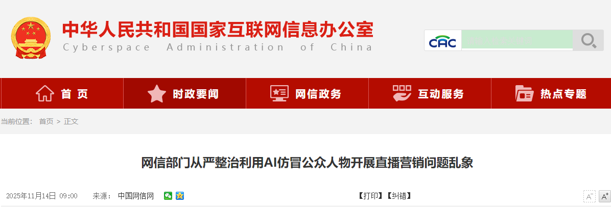 香港中通社11月14日電 據中國國家互聯網信息辦公室14日消息,近期,有網絡賬號利用AI技術仿冒公眾人物形象,在直播、短視頻等環節發布營銷信息,誤導網民,涉嫌虛假宣傳和網絡侵權,嚴重破壞網絡生態,造成不良影響。中國網信部門對此從嚴整治。