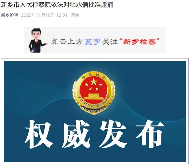 香港新聞網11月16日電 央視新聞11月16日消息,嵩山少林寺原住持釋永信涉嫌挪用資金等案,經河南省公安廳指定新鄉市公安機關立案偵查,由新鄉市公安局提請新鄉市人民檢察院批准逮捕。日前,新鄉市人民檢察院依法以涉嫌職務侵佔罪、挪用資金罪、非國家工作人員受賄罪對釋永信作出批准逮捕決定。