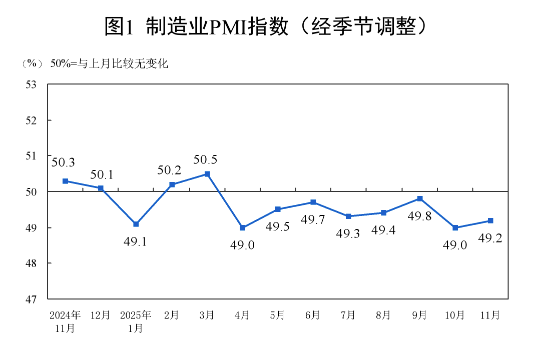 香港新聞網12月1日電 中國國家統計局11月30日發布數據顯示,2025年11月製造業採購經理指數(PMI)微升至49.2%,較10月回升0.2個百分點,結束此前連續兩個月回落態勢。儘管指數已連續八個月低於50%的榮枯線,但部分關鍵指標呈現回暖跡象,顯示在政策支持與外部環境改善背景下,中國經濟初現趨穩信號。