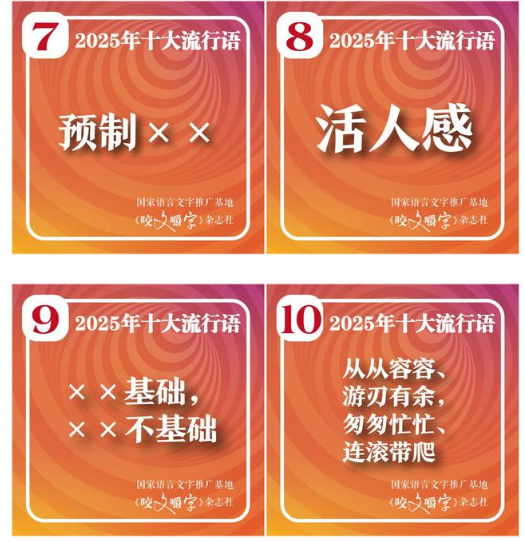 2025年十大流行語。 《咬文嚼字》編輯部發佈的2025年十大流行語分別是:“韌性”、“具身智能”、“蘇超”、“賽博對賬”、“數字游民”、“榖子”、“預制”、“活人感”、“××基礎”、“從從容容、游刃有餘,匆匆忙忙連滾帶爬”。 董觀志認為,年度流行語不僅是語言游戲,也是社會心態的晴雨表與經濟轉型的註腳。從2022年的“內卷”和“躺平”折射出職場青年的生存困境;到2023年“顯眼包”的走紅,標誌著年輕人對完美人設的解構,而這種心態演變在2024年達到新高度——“鬆弛感”入選年度詞,流行語精準捕捉了社會情緒的微妙轉折。還有一些流行語更推動了產業的發展,2024年"city不city"成為文旅現象,帶動外國遊客來華熱潮。 2024年6月,外國博主"保保熊"在短視頻中魔性詢問"city不city啊",將英文單詞"city"融入中文"x不x"句式,形成中英混搭的幽默表達。該梗因洗腦語調迅速在抖音熱榜傳播,蔡少芬等明星參與模仿,衍生出"爬長城city不city"等旅遊場景應用。地方政府迅速地將這個流行語進行創意實踐,廣東梅州、江門等入選"2024最具潛力文旅城市"後,主動將"city不city"融入宣傳,突出文化多樣性,各地文旅局抓住機遇,如甘肅用"甘肅也超city啊"宣傳絲路文化,長沙以"太平街city walk"網紅城市形象吸引外國遊客。 隨著2023年“人工智能+”首次寫入政府工作報告,這兩年有關科技與“未來產業”成為熱詞。《咬文嚼字》主編黃安靖認為,智能時代已經來臨,漢語詞庫更新加速,增添了大批與人工智能相關的語詞,語言打上了明顯的智能時代的烙印,人工智能在深刻改變這個世界的同時,也正在重塑我們的語言結構。 董觀志表示,從今年的流行語中可以看到三個鮮明的時代特點,一是技術與人性的深度博弈,“具身智能”的興起標誌著AI從虛擬算法向物理實體的跨越,而當AI越來越逼真,"活人感"反映技術越發達,真實人性越被珍視的矛盾;其次是人們生活方式的範式轉移,“數字游民”打破地理限制的遠程工作模式,催生"流動性生存"新常態,重構了傳統職業與居住的綁定關係,其次是亞文化的破圈與商業重構,“榖子經濟”的爆發,二次元衍生品從亞文化圈層走向大眾市場,形成設計-製造-收藏的完整產業鏈,體現Z世代消費力對產業結構的重塑,“蘇超”聯賽的示範效應讓群眾體育賽事通過全民參與、文化共振、經濟驅動三重融合,成為城市文化新名片,推動"體育+"模式全國複製。 現在流行語變得太快,但或許,流行語最珍貴的價值,是讓我們在快速變遷的時代,依然能觸摸到集體記憶的溫度。 (完) 【編輯:錢林霞】