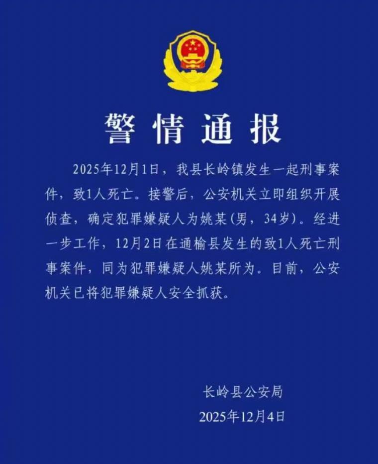 吉林松原長嶺縣公安局4日通報:12月1日,該縣長嶺鎮發生一起刑事案件,致1人死亡。接警後,公安機關立即組織開展偵查,確定犯罪嫌疑人為姚某(男,34歲)。經進一步工作,12月2日在吉林白城通榆縣發生的致1人死亡刑事案件,同為犯罪嫌疑人姚某所為。目前,公安機關已將犯罪嫌疑人安全抓獲。 此前,通榆縣公安局情指中心12月2日發布的協查文書顯示:近日,長嶺縣發生一起惡性案件,姚某有重大作案嫌疑。嫌疑人姚某34歲,男,身高165厘米至170厘米,方圓臉,黑色中長髮,皮膚偏黑,案發時上身穿黑色衣服,下身穿黑色褲子,運動鞋。請各單位立即開展工作,如有線索第一時間上報縣局情指中心。文書上還公布了嫌疑人姚某的照片。(完) 【編輯:吳一帆】