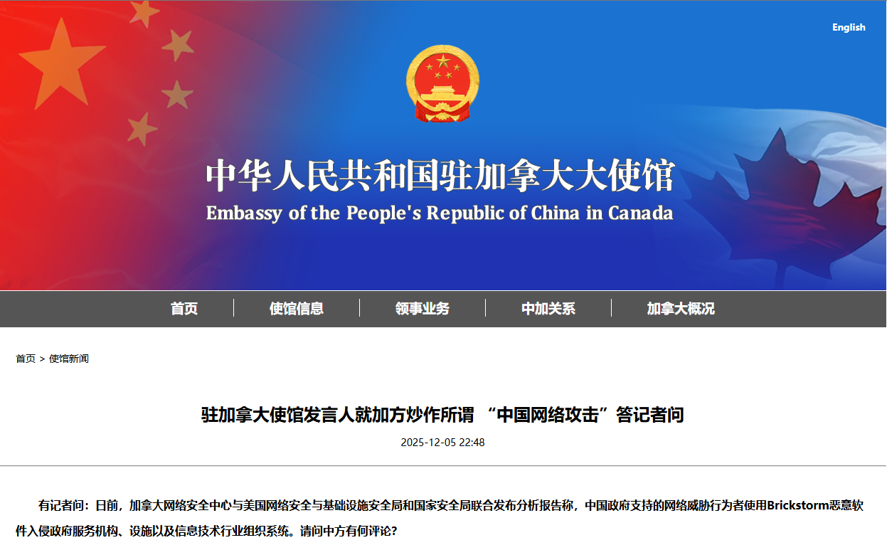 圖片來源:中國駐加拿大使館官網截圖 日前,加拿大網絡安全中心與美國網絡安全與基礎設施安全局和國家安全局聯合發布分析報告稱,中國政府支持的網絡威脅行為者使用Brickstorm惡意軟件入侵政府服務機構、設施以及信息技術行業組織系統。 中國駐加拿大使館發言人6日對此表示,眾所周知,美國才是名副其實的“黑客帝國”,是網路攻擊的集大成者和全球網絡安全的最大威脅。所謂分析報告對美國肆無忌憚的網絡攻擊行為視而不見,卻對中國進行無端栽贓抹黑,純屬賊喊捉賊、別有用心,中方對此堅決反對。 發言人強調,中國是網絡攻擊的主要受害國之一,一貫堅決反對并依法打擊一切形式的網絡攻擊行為,堅定致力於維護網絡安全。(完) 【編輯:林曉惠】